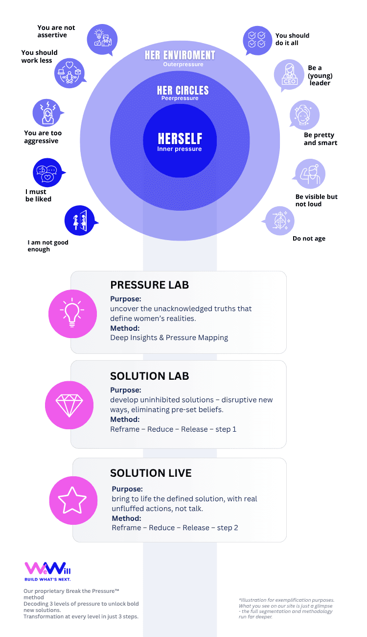 We enable businesses to understand and create solutions for women both inside organizations (as employees) and in the market (as customers).